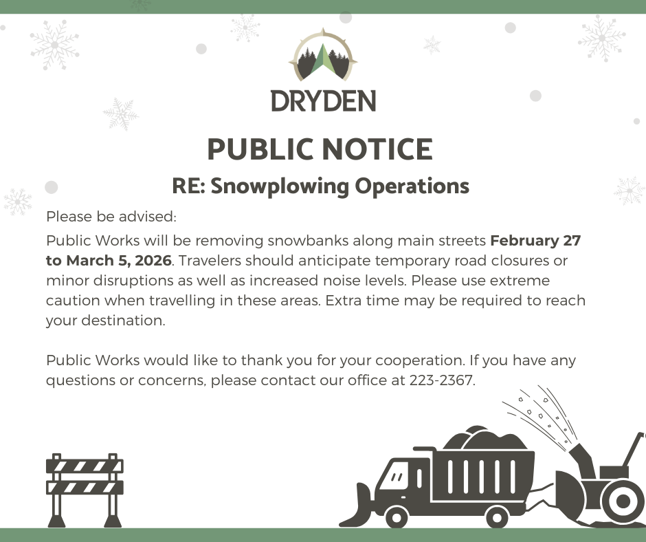 Please be advised Public Works will be removing snowbanks along main streets February 27 to March 5, 2026. Travelers should anticipate temporary road closures or minor disruptions as well as increased noise levels. Please use extreme caution when travelling in these areas. Extra time may be required to reach your destination.